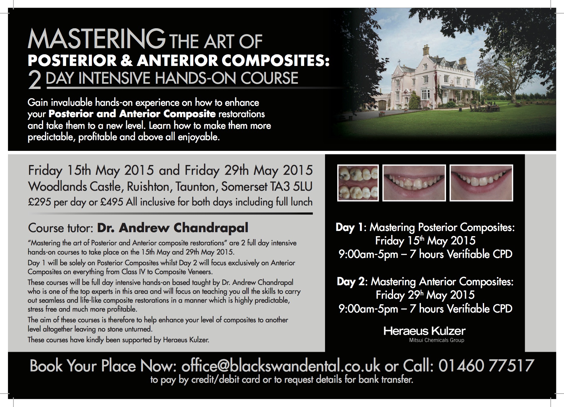 Its finally ready to go….after months of organisation between Black Swan Dental Spa and Hereaus we have the official 2 day Posterior and Anterior composite course by Dr Andrew Chandrapal to announce…Learn how to master both arts as a general dental practitioner to achieve stunningly beautiful results whilst also making it profitable and enjoyable for yourself.